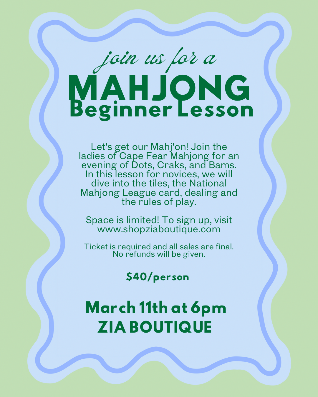 Let's get our Mahj'on! Join the ladies of Cape Fear Mahjong in-store at ZIA for an evening of Dots, Craks, and Bams. In this lesson for novices, we will dive into the tiles, the National Mahjong League card, dealing and the rules of play.