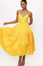 Step into elegance with the Atherton Dress, a stunning yellow midi designed to make you the belle of the ball. Its flattering silhouette is complemented by an optional belt, allowing you to define your waist for a personalized touch. Perfect for sophisticated occasions, this dress combines timeless style with vibrant charm.