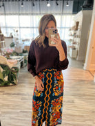oversized brown turtleneck with plum undertones. Zelle is shown in a small, with room.