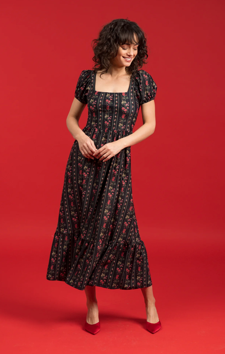 Think of it as everyday Bridgerton wear. You'll love the faux boning on the bodice for a figure-flatting shape with a gorgeous bottom tier. Oversized puff sleeves make this romantic midi a favorite.