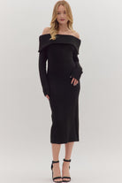 Elevate your wardrobe with the Eloise Sweater Midi Dress, a chic and effortless off-shoulder design in classic black. Its soft knit fabric gently contours to your silhouette, offering both comfort and refined style. Perfect for sophisticated occasions, this dress combines understated elegance with a modern twist to keep you looking polished from day to night.