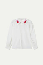 This button-down top features a delicate embroidered collar, adding a refined touch to your wardrobe. Perfectly paired with a navy or blush mini skirt, it effortlessly elevates your look. It also complements denim for a polished yet casual outfit.