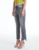 cut off step hem denim in a deep granite color for fall.