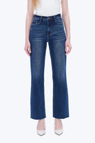 Crafted from stretch denim fabric, high-waisted wide-leg denim jeans with five pockets, a frayed hem, and a natural whiskering and fading effect.