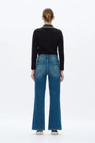 Crafted from high-stretch denim, these jeans feature a classic five-pocket design with a distressed front panel. The waistband is adorned with a double stitching detail and has a raw-edge finish at the back. Distressed hems and a cuffed ankle complete the look.