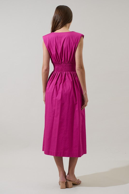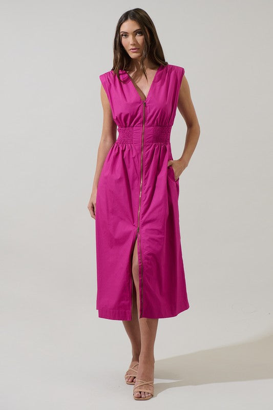 Cinch waist midi dress with two-way zipper.