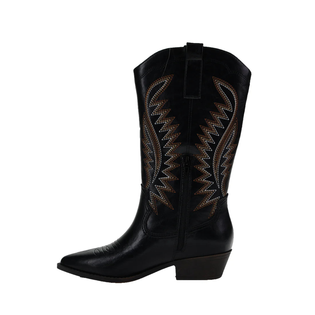 Get ready to turn heads with the Jumble Western Boot in Black! This smooth embroidered boot adds a bold twist to any outfit. Step out in style and make a statement with every step!