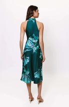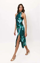 Elevate your evening look with the Mari High Neck Dress, crafted from smooth satin for a luxurious feel. This sleek maxi dress features a sophisticated high neckline with a delicate tie detail and a daring thigh-high slit that adds a touch of allure. Fully lined and equipped with a side zipper for a perfect fit, it measures 51" from high point shoulder. Designed for elegance and comfort, this dress is best cared for with dry cleaning to maintain its pristine finish.
