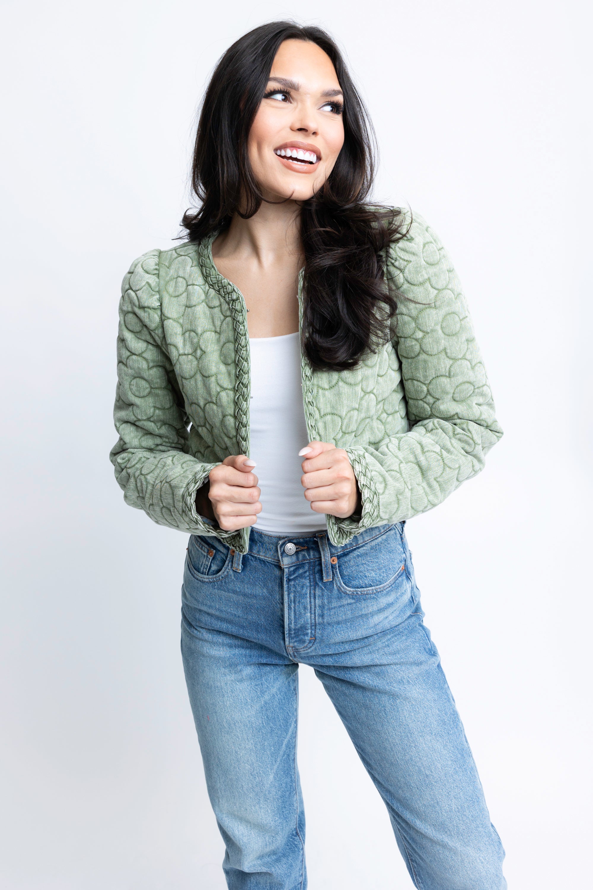 Quilted floral jacket in a versatile green that will transcend seasons.