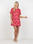 The Royale Shift in Cheeky Cheetah is a classic shift dress reimagined with a playful pink-and-red design featuring unexpected cheetah faces. Designed with a crew neckline, short sleeves with gold button detail, and flattering princess seams, it offers a tailored yet loosely structured silhouette. An easy everyday shape with an elevated twist, perfect for making a statement in comfort this holiday season.