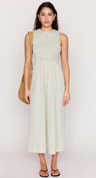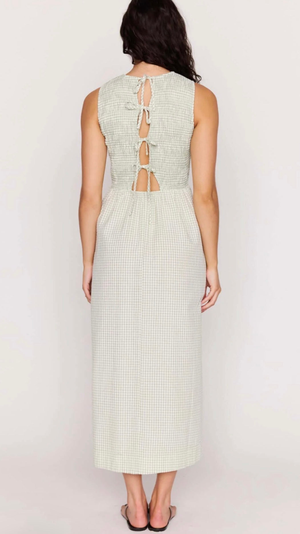 smocked bodice gingham dress with pockets and tie back.