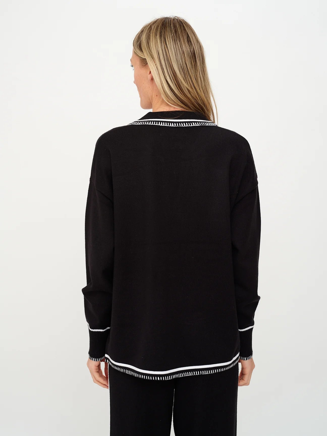 The kellie top brings a fun twist to your wardrobe with its cozy feel. Featuring a stitched v-neck with a chic collar, this top stands out with its sleek black base accented by crisp white trimming. Perfect for adding a playful yet polished touch to any outfit! Pair it back to the kellie pants for an instantly chic outfit.