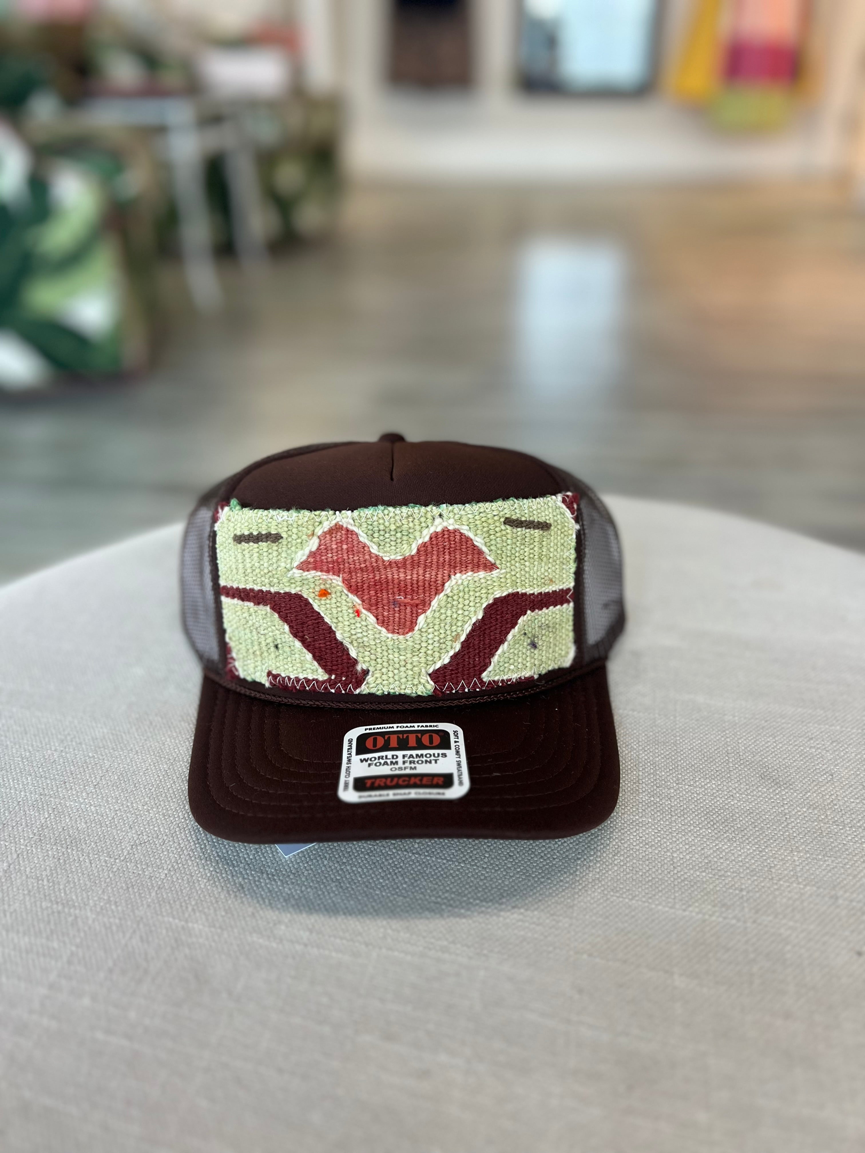 Best selling trucker hat with kilim patch - drop down menu will allow you to see the specific patch.