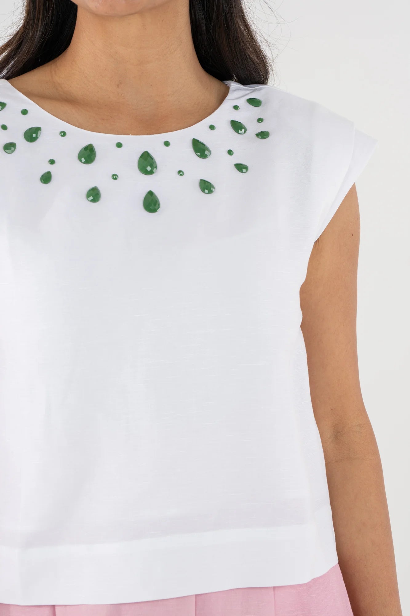 The Hatti Tank in Lucent White features a classic round neckline adorned with green pear-shaped stones that add subtle dimension and visual interest. Designed with padded shoulder cap sleeves, a green covered button back closure, and a boxy silhouette, it offers a modern shape with thoughtful detailing throughout.