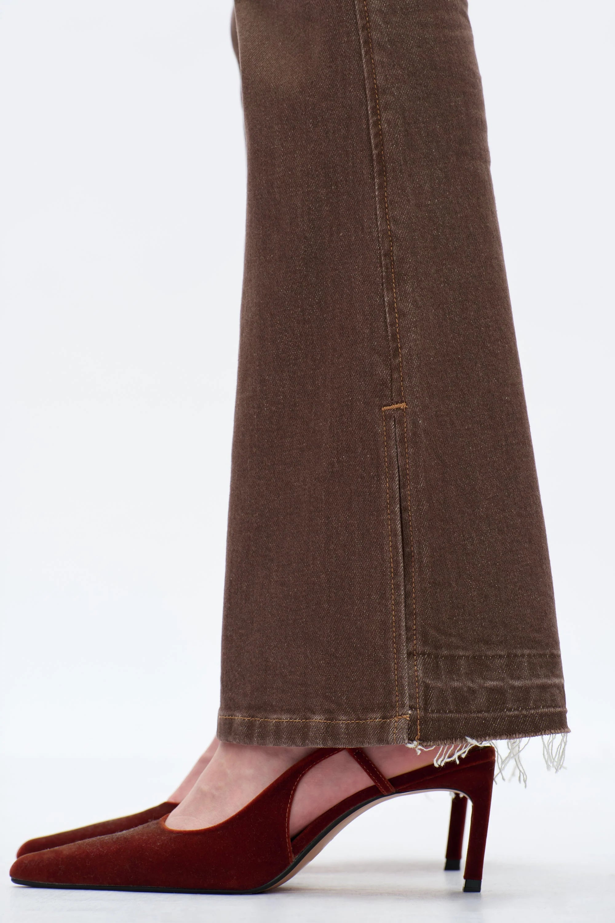 These jeans sit comfortably at the high waist and have a relaxed fit through the leg that flares at the bottom. The dark brown denim has a consistent, even wash and a frayed hem.