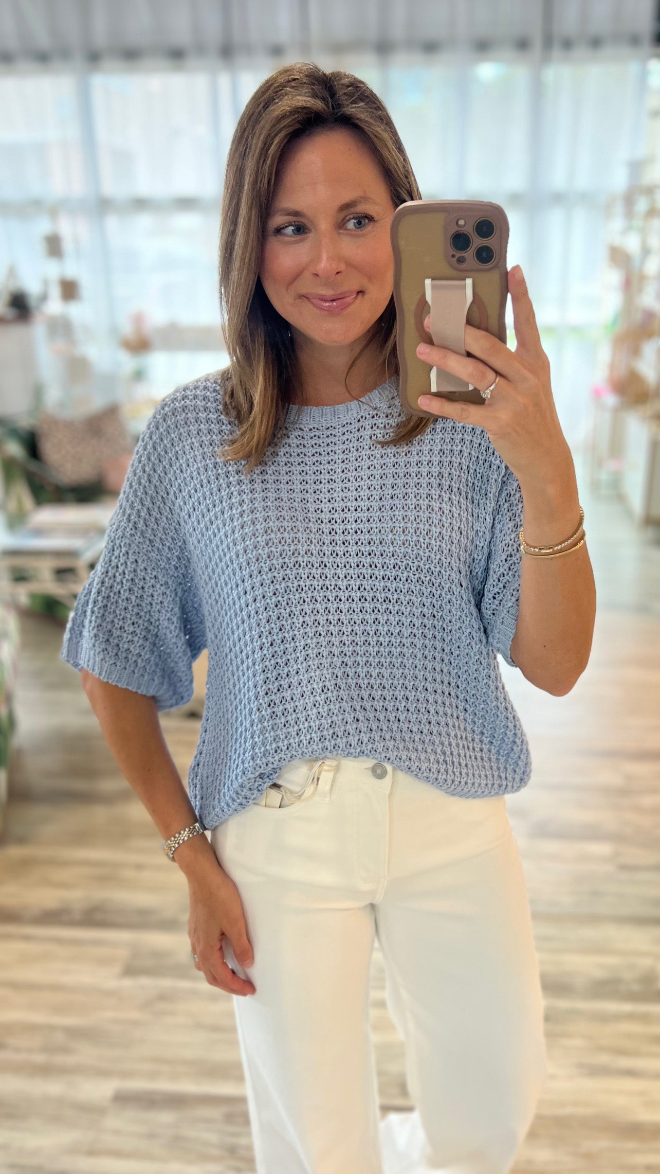 The boat sweater you need! This oversized, open-weave sweater is perfect with white denim or with denim shorts and your bathing suit.