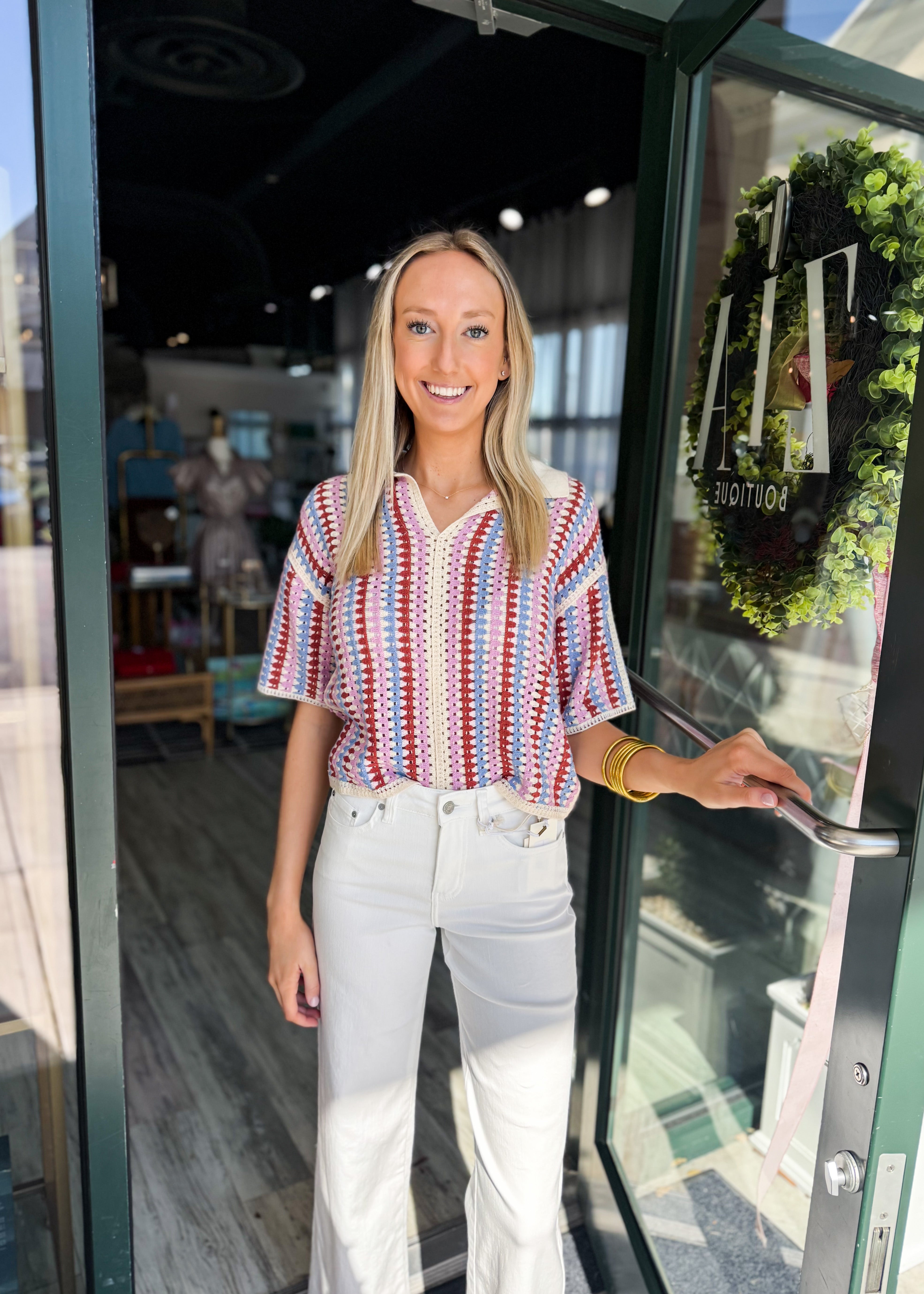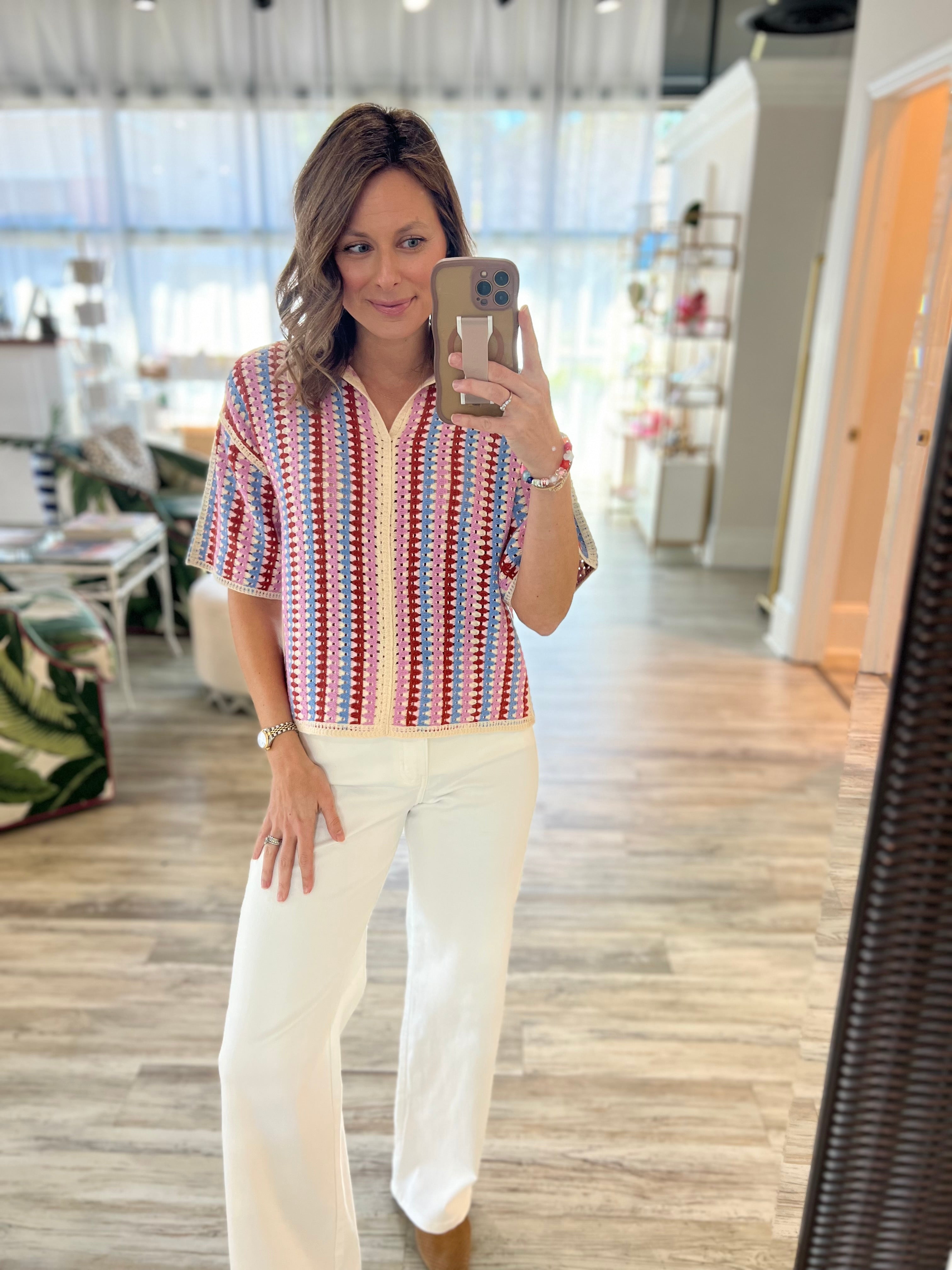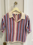 Colorful knit top. We're loving it white jeans or denim cutoffs.