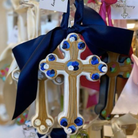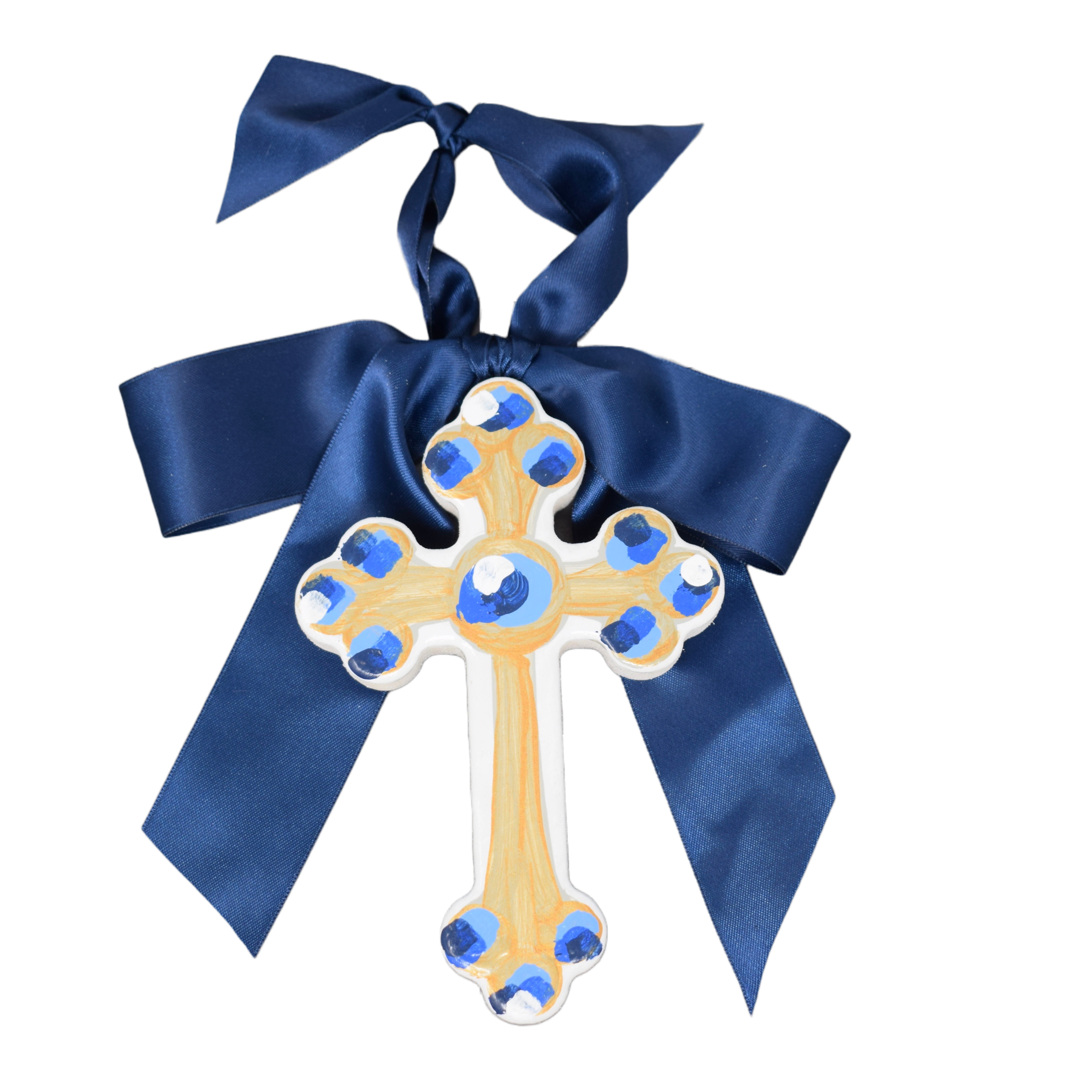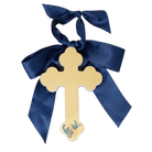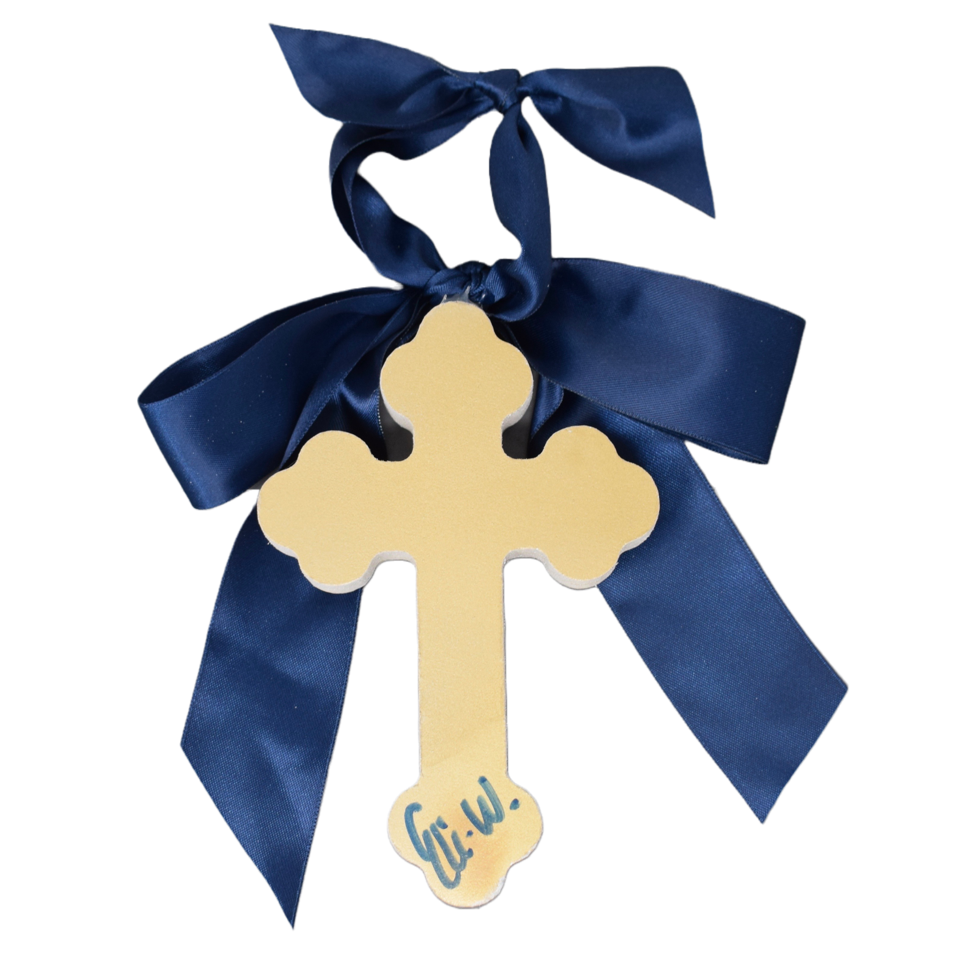 Each of our products are individually hand-painted, so what you receive may vary slightly in design. * Cross made of 3/4" thick MDF * 6" in length * Satin bow attached to the top * Back painted gold and signed by the artist * Hand-painted in Raleigh, NC