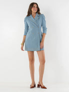 The Bradshaw Dress in Denim is a tailored blazer-style mini designed with a flattering, structured silhouette. The sharp lapel is accented with gold studs, complemented by a double-breasted front with gold snap closures. Quarter-length sleeves are finished with subtle ruching at the shoulders and hems for added shape. The skirt is trimmed with a row of gold studs, tying the design together with a refined yet bold touch. Fully lined in our signature bandana print, this style blends classic tailoring with statement-making details.