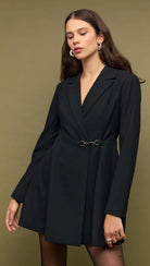 The Hilda Black Blazer Mini Dress With Buckle Detail is the ultimate fusion of tailoring and modern femininity. Designed in a sleek mini length, this dress features structured shoulders, a notched lapel, and a front clasp fastening for a polished finish. With its long sleeves and fitted silhouette, it transitions effortlessly from workday chic to evening glam. Pair with heels for a night out or style with boots for a contemporary edge.